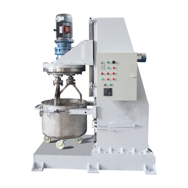 3、料筒:物料在不銹鋼材質的料筒內進行攪拌。料筒裝在升降平臺上,通過油缸實現升降。料筒下部裝有滾輪,可以推進。拉出。當攪拌器旋轉時,料筒由擺線針輪減速機通過凸輪和滾輪帶動同時旋轉,旋轉方向可以選擇??刂泼姘迳涎b有變頻調節(jié)旋鈕,可以根據工藝要求調節(jié)旋轉速度。